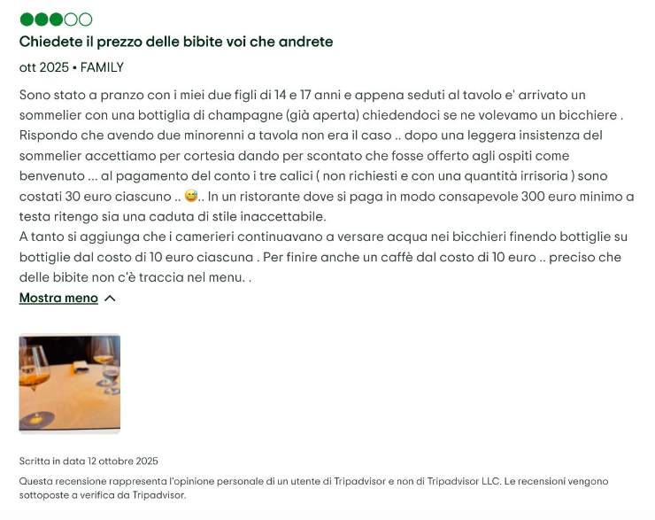 “Sono stato a pranzo con i miei due figli di 14 e 17 anni e appena seduti al tavolo è arrivato un somelier con una bottiglia di champagne (già aperta) chiedendoci se volevamo un bicchiere. Rispondo che con due minorenni a tavola non era il caso…” si legge nella prima parte della recensione del cliente, che poi continua spiegando come, dopo l’ulteriore invito del cameriere, abbia accettato pensando si trattasse di un omaggio di benvenuto.
